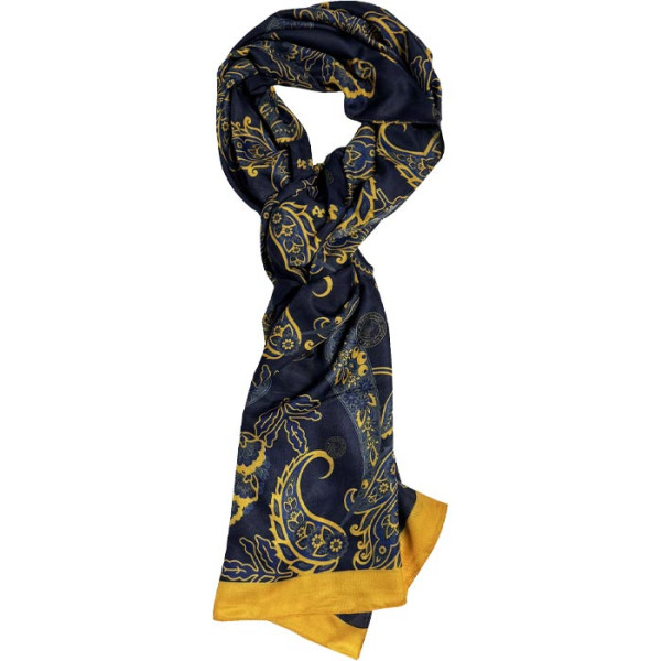 Das dunkelblaue Grunddesign wird durch edle goldene Akzente veredelt und erinnert optisch an ein hochwertiges Designer-Modell. Die extra breite Form verleiht dem Schal eine markante Präsenz und macht ihn sowohl als Statement-Accessoire als auch als stilvolle Ergänzung zu Mantel oder Jacke perfekt.